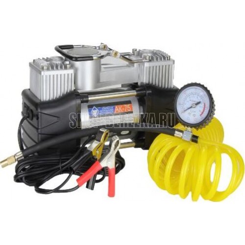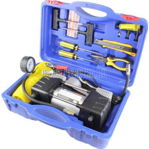 Мощность – 180 Вт. - Максимальная сила тока – 20 А. - Максимальное давление – до 10 кг/см? (150PSI/10Bar) - Производительность – до 75 л/мин. - Шнур питания – 2,7 м. - Воздушный шланг – 5м. - Пластиковый кейс для хранения и переноски - Подключение к клеммам АКБ при помощи металлических зажимов - Комплект насадок-переходников – 3 шт. -Набор дорожного инструмента Цвет- серебро Напряжение питания - 12В. Состав:металл, пластик