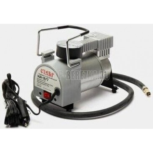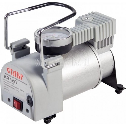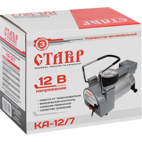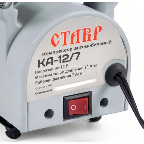Компрессор автомобильный СТАВР КА-12/7 Питание: гнездо прикуривателя автомобиля. Производительность 35 л/мин. Максимальное давление 10 атм. Рабочее давление 7 атм. Максимальный потребляемый ток 14 А. Диаметр цилиндра 30 мм. Длина воздушного шланга 1 м. Длина сетевого кабеля 3 м.