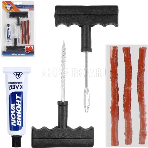 Предназначен для быстрого ремонта проколов бескамерных шин. Возможен ремонт без снятия колеса. Не предназначен для ремонта проколов диаметром более 6 мм. Не предназначен для ремонта боковых порезов шин. Использовать для ремонта только исправных и годных к эксплуатации шин с неистекшим сроком годности и допустимым износом протектора. Из-за незначительного веса жгута после ремонта шины нет необходимости делать дополнительную балансировку колеса. Комплектация: 1. Инструмент для подготовки отверстия – спиральный рашпиль 2. Инструмент для установки жгута в отверстие – шило с ушком 3. Набор армированных жгутов 4. Клей