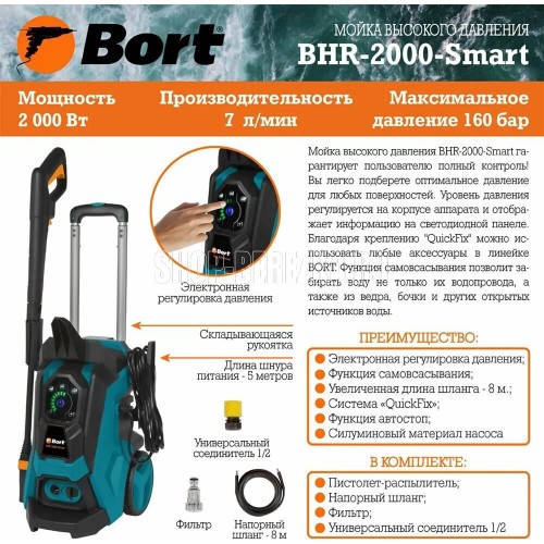 Потребляемая мощность, Вт2 000. Напряжение, В220.Максимальное давление, бар 160.Частота тока, Гц50.Рабочее давление, бар 120.Вес изделия, кг9,5.Материал корпуса насоса Силумин.Вес брутто, кг8,42 .Максимальная производительность (л/мин), л/мин7.Габариты упаковки, см30 x 33,5 x 52.Максимальная производительность (л/час), л/час420. Регулировка напора.Функция автоматического всасывания.Автостоп. Шланг, м8. Длина шнура питания, м5. 3 режима работы: мягкая струя, струя средней интенсивности, жесткая струя; тонкая регулировка мощности; сенсорное управление.