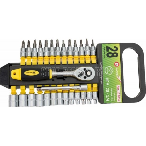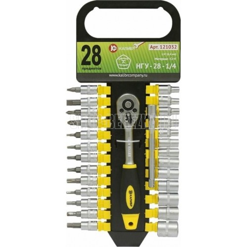 Набор головок универсальных с ключом-трещоткой Калибр НГУ-28-1/4 (артикул 121032) содержит 28 предметов и предназначен для работ в автомастерских и для индивидуального применения. Все инструменты выполнены из хромванадиевой стали со специальным покрытием для защиты от коррозии. В набор входит: Трещотка 1 шт. Головки торцевые 4/4,5/5/5,5/6/7/8/9/10/11/12/13/14мм 13 шт. Биты T10,T15,T20,T25,T30,HEX H3,H4,H5,H6,SL5.5,SL7,PH1,PH2 13 шт. Удлинитель 100 мм 1 шт.