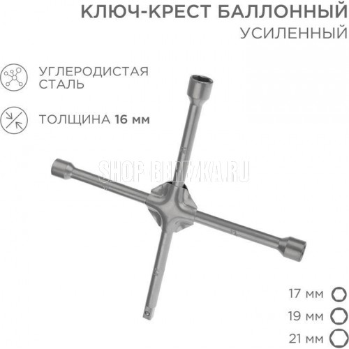 Ключ-крест баллонный предназначен для смены колес грузовых или легковых автомобилей. Усиленная крестовая конструкция обеспечивает надежность применения. Инструмент изготовлен из высококачественной углеродистой стали 45. Размер головок: 17х19х21мм х головка 1/2". Твердость материала рабочих частей ключа составляет 41 HRС.