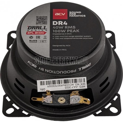 Пиковая мощность: 100 Вт Номинальная мощность: 40 Вт Чувствительность: 94 ( 1) Импеданс: 3 Ом Особенности модели Звуковая катушка: KSV 25.5 мм Диффузор: Прессованная целлюлоза Материал подвеса: Резина Магнит: Ферритовый 70*12 мм Диапазон частот: 100 - 20000 Гц Общие характеристики Количество полос: 1-полосная Диаметр монтажного отверстия: 94 мм Монтажная глубина: 50 мм Общая глубина: 52 мм Внешний диаметр: 102 мм