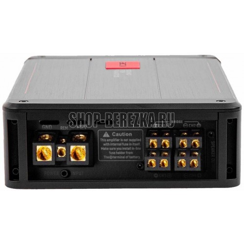 Номинальная мощность 4 Ом: СТЕРЕО 350Вт х 4, MOHO в мостовом включении: 1000Вт х 2 Номинальная мощность 2 Ом: СТЕРЕО 500Вт х 4 Чувствительность: 200мВ – 8В Отношение сигнал/шум: >91 дБ Коэффициент гармонических искажений: (THD) @ 1 кГц (4 Ом) 0,05% Особенности модели Класс усилителя: D Стабильная работа на нагрузке: 2 и 4 Ом Bass Boost: 0~12дБ Диапазон частот: 10 Гц ~ 50 кГц Общие характеристики Размеры: 314x145x52 мм Питание Рабочее напряжение: 10-15В пост. ток Разделение каналов Разделение каналов: >60 дБ Low pass фильтр: 10Гц ~ 8кГц High pass фильтр: 10Гц ~ 8кГц Число каналов: 4/3/2