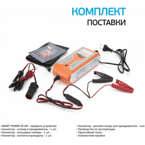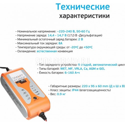 Подключение на входе бытовая сеть Напряжение на входе 220-240 В Выход Подключение на выходе клеммы Напряжение на выходе 14.4-14.7 В Ток на выходе 8 А Параметры батареи Емкость заряжаемой батареи 6-160 А*ч Поддерживаемые батареи все типы 12-ти вольтовых батарей (WET, MF, VRLA, Ca, AGM, GEL) Минимальный остаточный заряд батареи 2 В Особенности Индикатор заряда есть Индикатор питания есть Рабочая температура от -20 до +50°С Особенности 9 стадий зарядки + автоматический цикл, индикатор "ошибка" загорается при которком замыкании/неверной полярности/неисправном аккумуляторе, выбор режима работы,режим "зимняя зарядка" Корпус Класс защиты IP44 Ширина 95 мм Высота 60 мм Глубина 220 мм Вес 0.9 кг