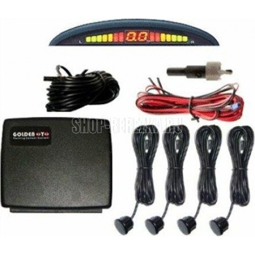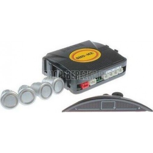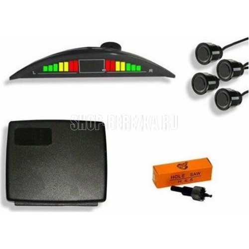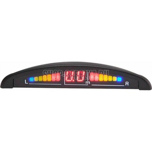4 датчика даиметром 22 мм. Дисплей 11х2,7х2,1 см. Место установки: передняя панель. Визуальное и звуковое оповещение о препятствиях. На дисплее высвечивается аналоговая шкала, позволяющая оценить скорость сближения, борт (правый или левый), со стороны которого зафиксировано препятствие, а также цифровая шкала с расстоянием до него.