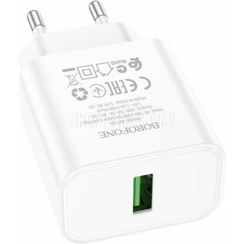 Borofone BA72A - это сетевое зарядное устройство с одним выходом USB-A и поддержкой стандарта быстрой зарядки QC 3.0, которое быстро и безопасно зарядит ваши устройства. Поддерживает силу тока до 3 А и обладает стабильным показателем мощности 18 Вт, что обеспечивает быструю зарядку устройства и сводит к минимуму возможные повреждения. Корпус изготовлен из огнестойкого пластика ABS + PC. Выполнено в двух цветах.