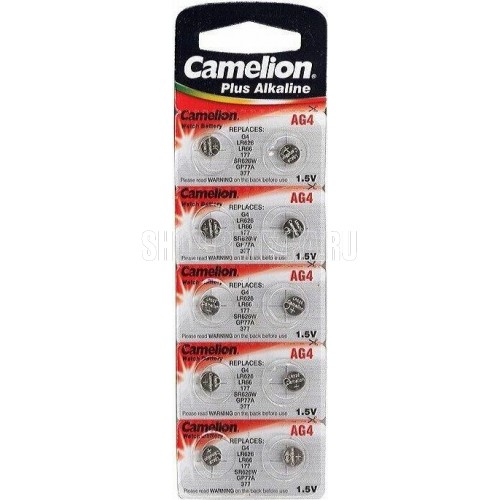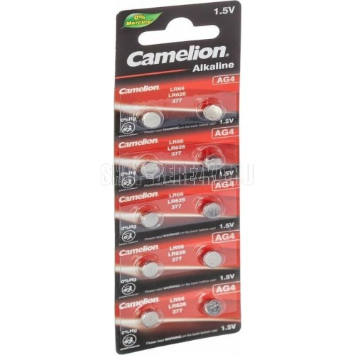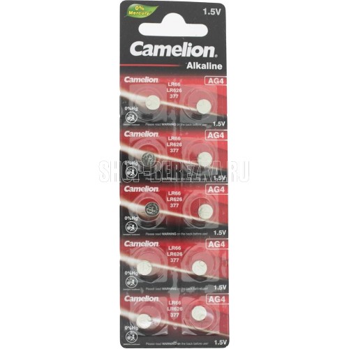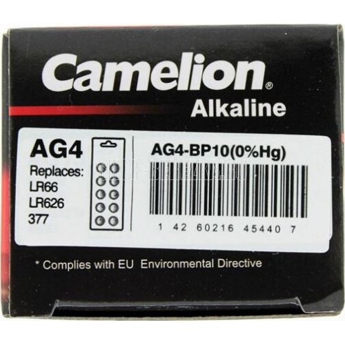 Батарейка алкалиновая Camelion G 4 BL-10 Mercury Free (AG4-BP10(0%Hg), 377A/LR626/177 батарейка для часов), напряжение 1,5В, емкость 18мА*ч, кол-во в упаковке 10 шт., размер упаковки 50x160x5 мм, использовать при температуре от -18 до +55 °C, хранить при температуре от + 15 до + 25 °C. Срок хранения 5 лет.
