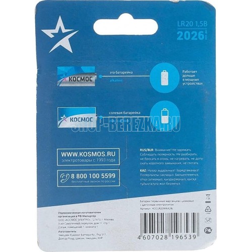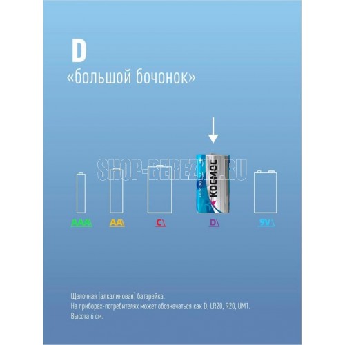 Батарейки алкалиновые,тип LR20, напряжение - 1,5V, форма упаковки - блистер, в блистере - 2 штуки, для питания устройств со средним потреблением энергии: фонари, стерео системы, игрушки и пр.