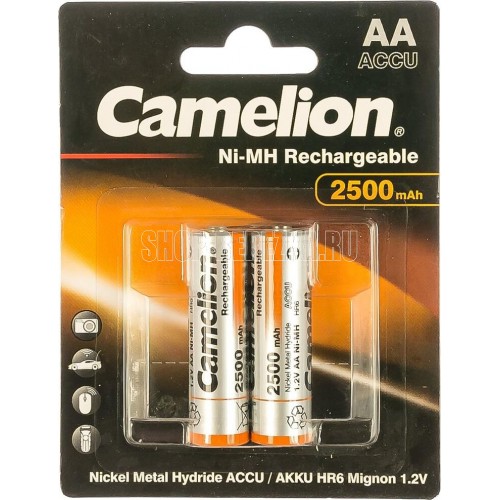 Аккумулятор Camelion NH-AA2500BP2, напряжение 1,2В, емкость 2500мА*ч, кол-во в упаковке 2 шт., размер упаковки 90x117x15 мм, использовать при температуре от - 20 до + 40 °C