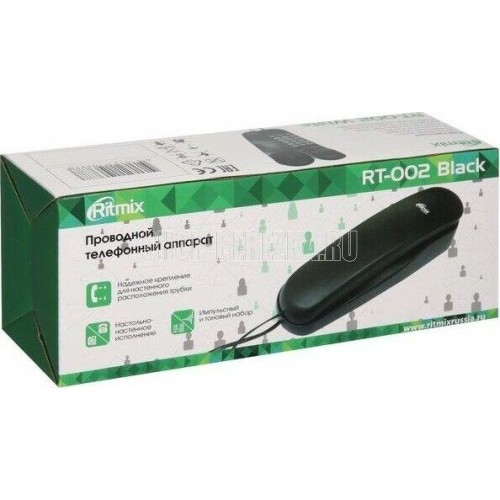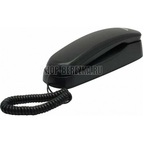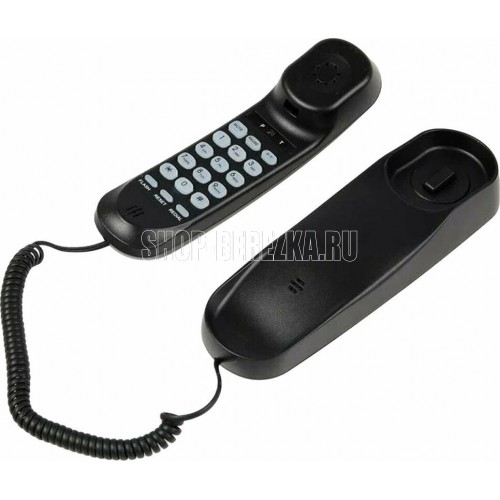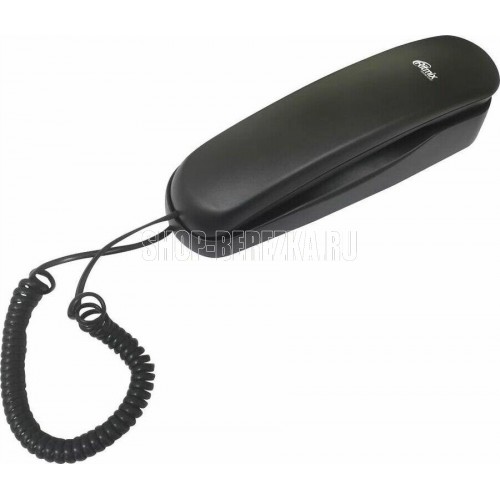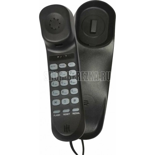 Проводной телефон, узкий корпус. Кнопки набора номера на трубке. Большие цифры на кнопках. Сброс/ Пауза/ Повтор номера. Регулировка громкости звонка. Переключение Импульсного/ Тонового набора номера (по умолчанию импульсный). 3 однокнопочных набора номера. 10 двухкнопочных наборовномера в памяти. Настольное и настенное крепление.