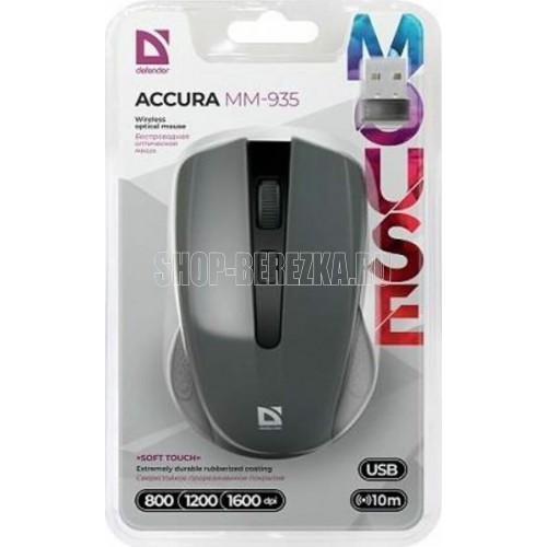 Мышь беспроводная оптическая, интерфейс USB, 4 клавиши+ колесо-кнопка, разрешение сенсора 800/1200/1600 dpi, сверхстойкое прорезиненное покрытие «Soft Touch», приятно на ощупь и предотвращает скольжение, радиус действия - 10 м, цвет: серый