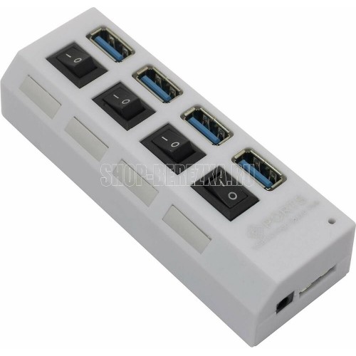 Концентратор, Материал корпуса - Пластик; Разъемы -4 х USB Type A 3.0; Выключатели порта с индикацией; Максимальная скорость чтения/записи: 5 гбит/с; Вес: 50 грамм; Упаковка: пластиковый блистер со стикером; Режим работы: OTG
