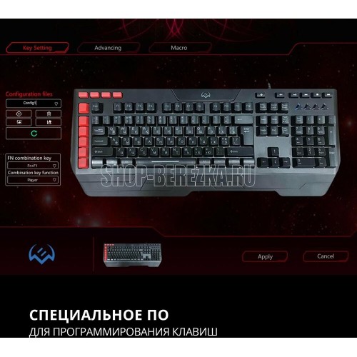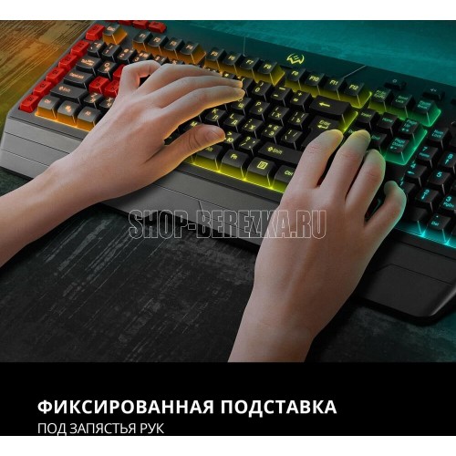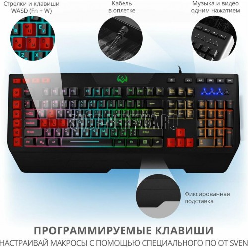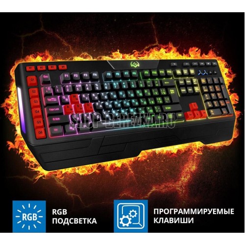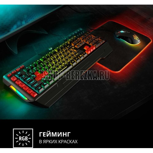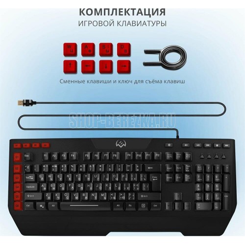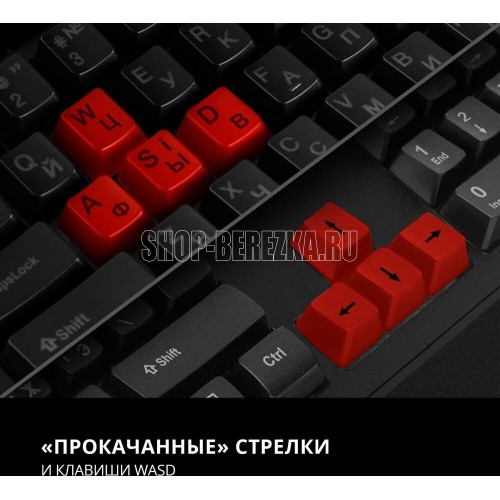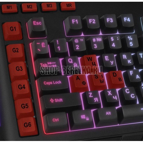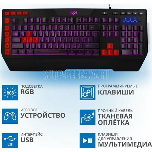 Клавиатура игровая, программируемая, проводная, интерфейс USB, количество клавиш - 120, клавиш быстрого доступа - 16, возможность записи макросов, подавление фантомных нажатий, 7 переключаемых цветов подсветки, длина кабеля - 1,8 м.