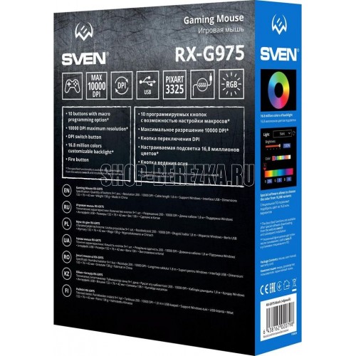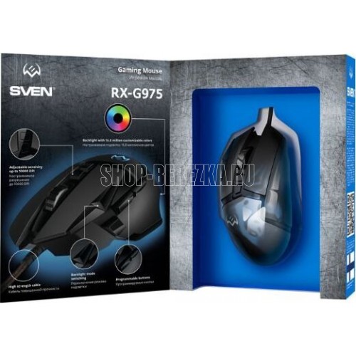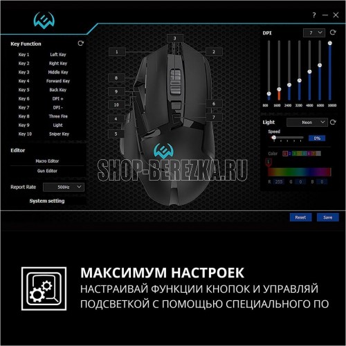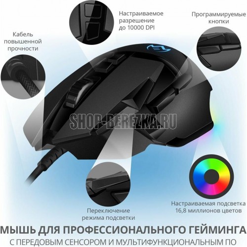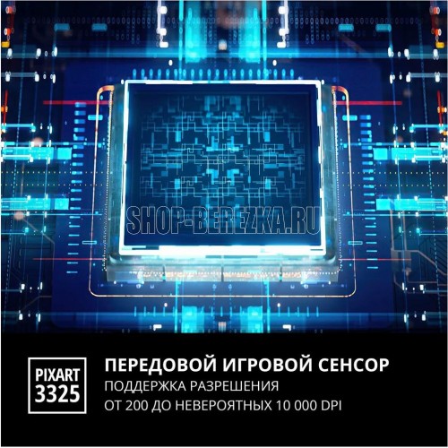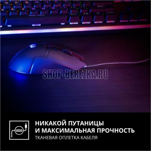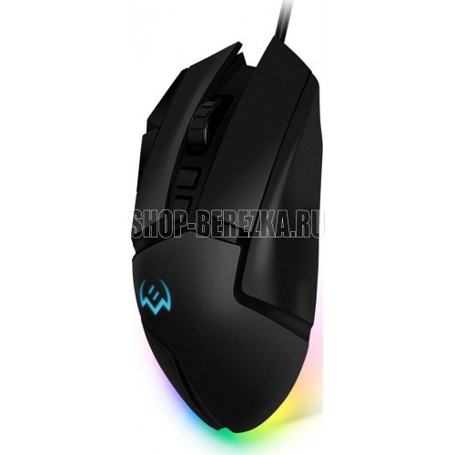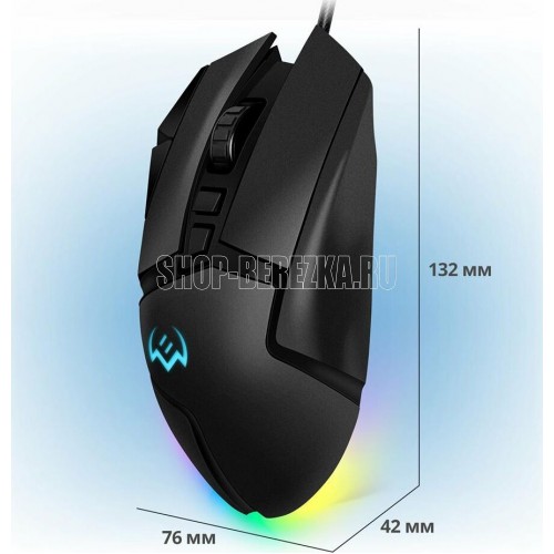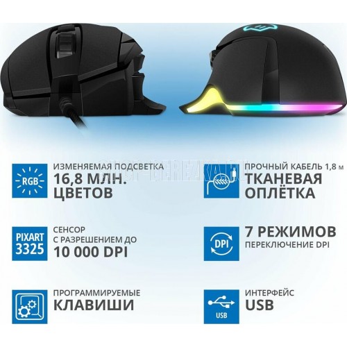 Мышь игровая, проводная, программируемая,интерфейс - USB, количество кнопок - 9, колесо прокрутки, разрешающая способность - 200-10000 dpi, боковые клавиши навигации, мягкий бархат софт-тач покрытия, длина кабеля - 1,8 м.