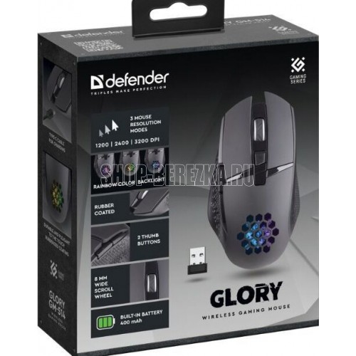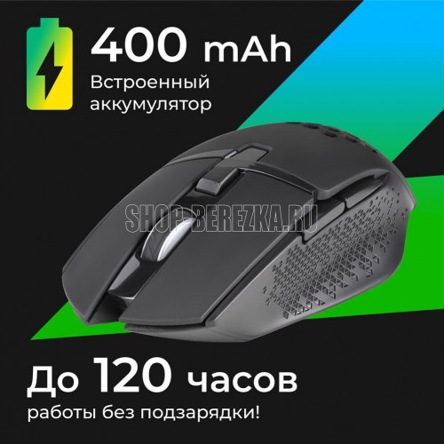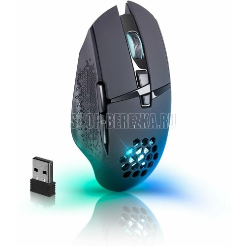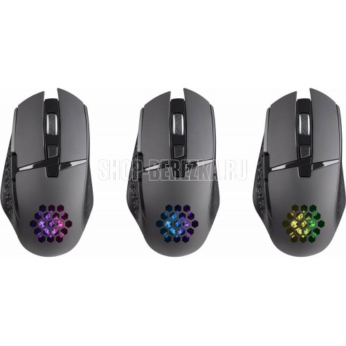 Мышь игровая, беспроводная, интерфейс USB, количество кнопок - 6, колесо прокрутки, емкость аккумулятора - 400 мА·ч, изменяемое разрешение 1200 / 2400 / 3200 dpi, Windows 2000/XP/Vista/7/8/10, Mac OS X10, переливающаяся подсветка, радиус действия -до 10 м.