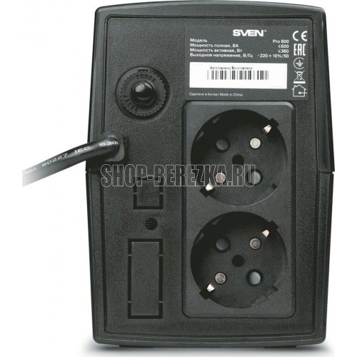 Тип ИБП линейно-интерактивный, Тип нагрузки: компьютер, монитор, Мощность полная, ВА: 600, Мощность активная, Вт: 360, Максимальная нагрузка, Вт 360, Уровень входного напряжения, В: ~165 – 275, Уровень выходного напряжения, В: ~220 ± 10 %, Форма выходного напряжения: апроксимированная синусоида, AVR (авторегулятор напряжения), Входная частота, Гц: 50, Рабочая частота, Гц: 50 ± 1 % (в режиме работы от батареи), Входная вилка: 1 х СЕЕ7/4, Выходные розетки, шт: 2 х СЕЕ7/4, Защита: от короткого замыкания, импульсных и высокочастотных помех; тепловая защита трансформатора, Типовое время переключения, мс: 10.