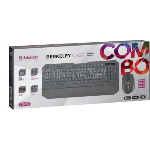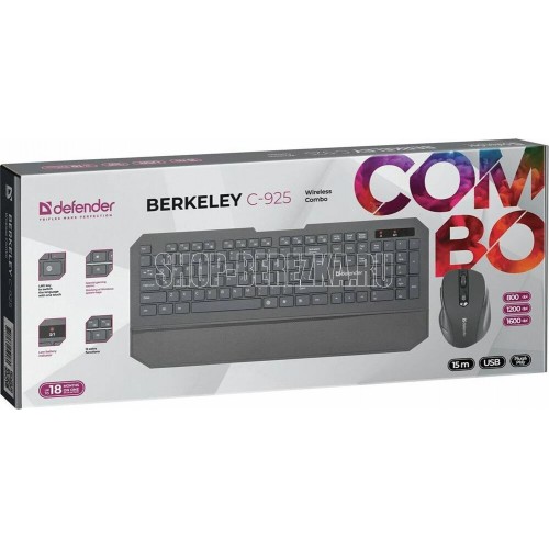 Интерфейс подключения: USB, Тип клавиатуры: Мембранная,Кол-во клавиш: 105 шт, Питание (клавиатура): 2 хAAA, Кол-во дополнительных клавиш (функций): 12 (+FN), Радиус действия: 0–15 м, Рабочая частота: 2,4 ГГц, Разрешение: 800/1200/1600 dpi, Количество кнопок (мышь): 5+колесо-кнопка, Тип сенсора: IR-лазерный, Системные требования для ПК: Windows 2000/XP/Vista/7/8/10, Mac OS X10 , Питание (мышь): 1хАА.