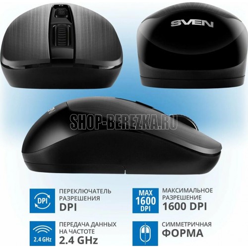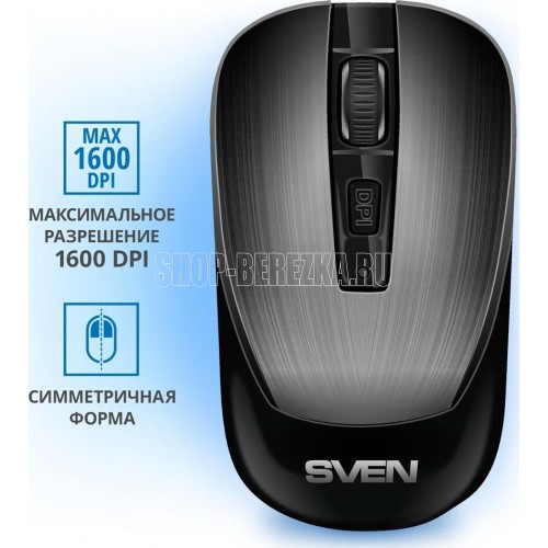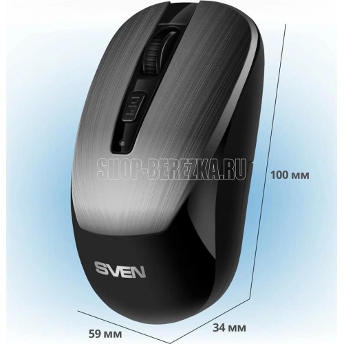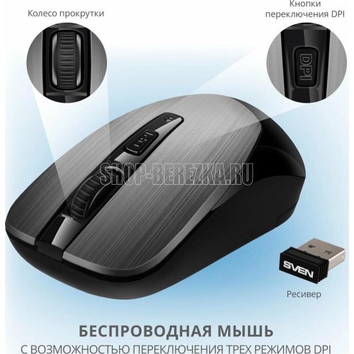 Тип мыши беспроводная оптическая, Совместимость c OC Windows и Mac OS, Количество кнопок, шт 5 + 1 (колесо прокрутки), Колесо прокрутки есть, Разрешающая способность, DPI 800/1200/1600, Интерфейс USB, Частота радиоканала, ГГц 2,4, Тип элементов питания 1хAA, Наработка на отказ, нажатий свыше 3 000 000, Соответствие стандартам FCC, CE, ЕАС, Размеры изделия, мм 100х59х34 Вес, г 54, Цвет серый металлик