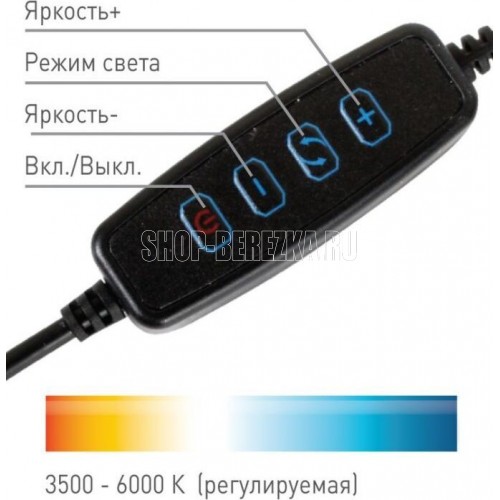 Светильник предназначен для блогеров, для визажистов/стилистов,очень удобен для проведения фото и видеосъ мки, проведения видеоконференций,, просто для освещения своего рабочего места и места рукоделия. Отличное освещение, телефон устанавливается в над жном зажиме, руки свободны, ничто не отвлекает от работы и общения Модель имеет удобный кнопочный пульт управления светом на проводе питания, позволяющий регулировать цветовую температуру 3500К-6000К и устанавливать комфортный уровень яркости (10 ступеней). Подключение светильников производится к разъ мам USB 5В,2А сетевых адаптеров, компьютеров, аккумуляторных накопителей энергии. Зажим смартфона установлен на гибком металлическом кронштейне, удерживает телефон шириной 6-8,5 см. Мощность 10 Вт, имеет плафон диаметром 26 см, установленный на металлическом подвижном шарнире, позволяющем устанавливать и фиксировать кольцевую лампу под любым углом наклона.