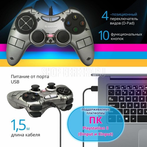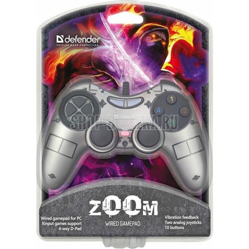 Проводной геймпад с поддержкой Dinput и Xinput игр., 10 кнопок, 4-позиционный переключатель видов, эффект вибрации - 2 встроенных вибромотора, питание от порта USB.