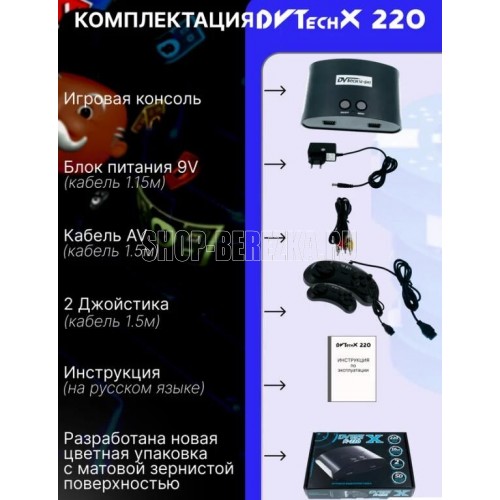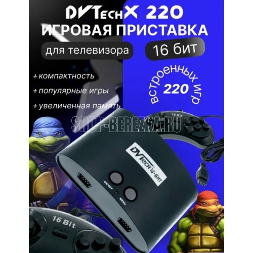 Тип устройства стационарная. Процессор 16-битный 7.61 МГц. Встроенные игры 220. Встроенная память 2048 МБ. Разрешение 320*240. Цвет 512 цветов. Звук стерео. Совместимость с играми 16-бит (формата .bin). Питание внешний блок питания 9 V. Разъем для подключения джойстиков 2 шт. 9 pin. Подключение AV 3x3 RCA. Разъем для карты памяти microSD и microSDHC. Длина сетевого кабеля 1.15 метра. Длина видео кабеля 1.5 метра. Длина кабеля джойстика 1.5 метра. Размер консоли 14.4/10/4.4. Вес консоли (кг) 0.158. Упаковка картонная коробка.