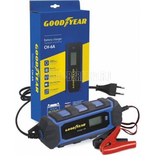 Электронное зарядное устройство Goodyear Smart для аккумулятора, модель CH-6A. Применяется для заряда всех типов свинцово-кислотных автомобильных аккумуляторов WET, MF, GEL, AGM. Напряжение электросети 220-240В (50Гц) Цвет корпуса Синий, черный