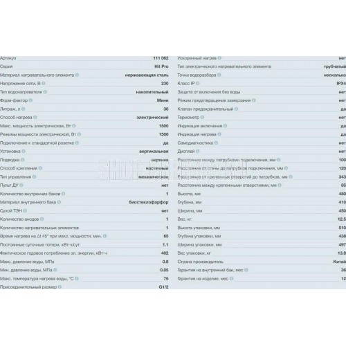 Материал нагревательного элемента нержавеющая сталь Напряжение сети, В 230 Тип водонагревателя накопительный Форм-фактор Мини Литраж, л 30 Способ нагрева электрический Макс. мощность электрическая, Вт 1500 Режимы мощности электрической, Вт 1500 Подключение к стандартной розетке да Установка вертикальная Подводка верхняя Способ крепления настенный Тип управления механическое Пульт ДУ нет Количество внутренних баков 1 Материал внутреннего бака биостеклофарфор Сухой ТЭН нет Количество анодов 1 Количество нагревательных элементов1 Макс. температура нагрева воды, °С 75 Присоединительный размер G1/2 Ускоренный нагрев нет Тип электрического нагревательного элементатрубчатый Точки водоразбора несколько Класс IP IPX4 Защита от включения без водынет Режим предотвращения замерзания нет Клапан предохранительный да Термометр нет Индикация включения да Индикация нагрева да Самодиагностика нет Дисплей нет Высота, мм480 Глубина, мм410 Ширина, мм450 Вес, кг12.5