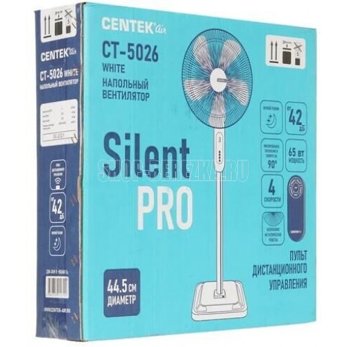 CENTEK CT-5026 WHITE (белый) 65Вт, SILENT PRO Напряжение питания 220-240 В~50/60 Гц Мощность 65 Вт Кол-во скоростей 4 Кол-во лопастей 5 Таймер до 9 часов Пульт дистанционного управления Ночной режим Низкий уровень шума Диаметр решетки 44,5 см