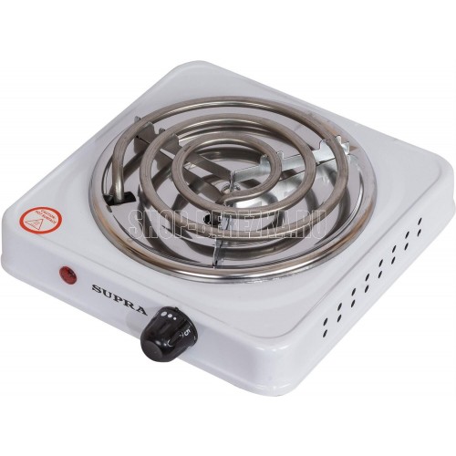 Электроплитка одноконфорочная. 1 спиралевый нагревательный элемент - 1000 Вт; корпус покрыт жаропрочной эмалью; плавное регулирование температуры конфорки; количество уровней мощности - 5; световая индикация, диаметр конфорки - 14.4 см; прорезиненные ножки.
