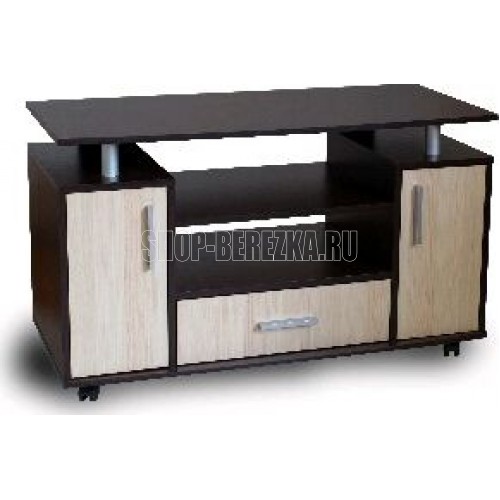 Функциональная тумба под ТВ, имеющая два распашных шкафа и выкатной ящик. Функциональная и стильная тумба под ТВ, идеально разместится в спальне или гостиной с любой обстановкой. Имеет два распашных шкафа и выкатной ящик. Также, имеет полки для размещения аудио и видео аппаратуры. Габариты высота: 1100 мм Габариты ширина: 505 мм Габариты глубина: 650 мм Стиль: Модерн Материал каркаса: ЛДСП Материал фасада: ЛДСП Тумба с ящиком: да Колесики: да Количество ящиков: 1 Цвет корпуса: венге/ясень
