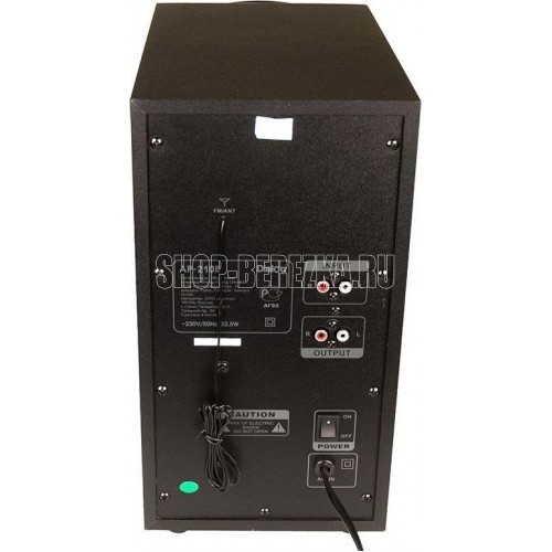 Активная акустическая система 2.1. Поддержка карт SD (Secure Digital), USB, FM, Bluetooth. Мощность RMS (Вт): 60 (30+15+15). Усилитель: встроенный. Компоненты: сабвуфер, два сателлита, пульт ДУ. Входы: стереовход (2RCA); USB порт для флэш-накопителей; Слот для SD карт; беспроводное Bluetooth соединение. Сабвуфер - 5,25". Частотный диапазон (Гц-Гц): от 40 Гц. Сопротивление (Ом): 4. Габаритные размеры (В*Ш*Г): 325*310*170 мм. Сателлиты - 3". Частотный диапазон (Гц-КГц): до 20 кГц. Сопротивление (Ом): 4. Габаритные размеры (В*Ш*Г): 200*110*110 мм. Корпус: 9 мм сабвуфер / 5 мм сателлиты. Длина сетевого кабеля: 1,5 м.
