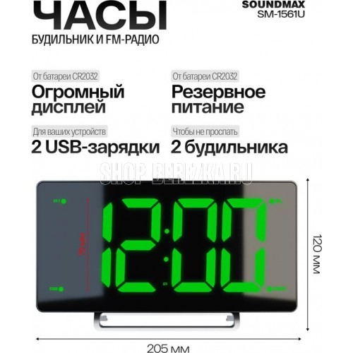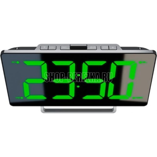 Светодиодный дисплей с высотой символов 3" (7.62 см) Плавная регулировка яркости дисплея Кварцевый стабилизатор Два будильника Два режима работы будильника (сигнал/радио) Отложенный сигнал будильника Отключение радио по таймеру Формат времени 12/24 часа FM-тюнер (87.5 – 108 МГц) Встроенный динамик Два USB-порта для зарядки мобильных устройств (5 В 1 А) Питание от адаптера (в комплекте) Индикация: зеленая Цвет: чёрный