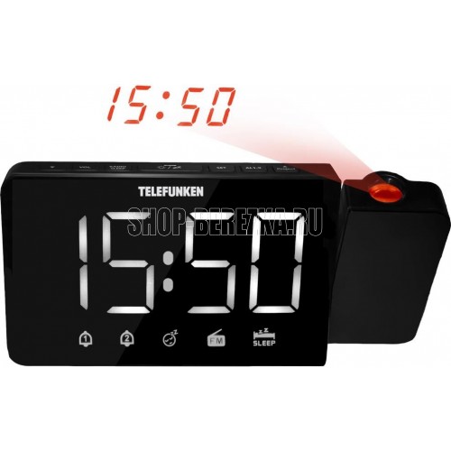 Светодиодный дисплей с высотой символов 1,6” (4.06 см) Регулируемая яркость дисплея (3 уровня) Кварцевый стабилизатор Два будильника Два режима работы будильника (сигнал/радио) Отложенный сигнал будильника Отключение радио по таймеру Настраиваемый проектор Регулируемая яркость проектора (2 уровня) FM-тюнер (87.5 – 108 МГц) Выходная мощность: 1 Вт Питание от адаптера (в комплекте) Индикация: белая Цвет: чёрный