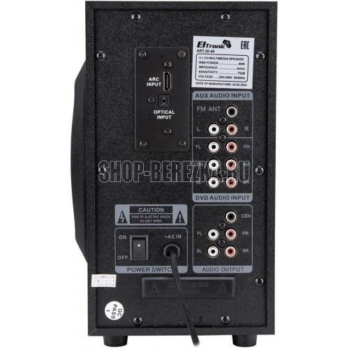 "Акустическая система 5.1 ELTRONIC HOME SOUND Режимы воспроизведения: - Bluetooth - Внешний накопитель - Aux, HDMI ARC, Optical - FM Мощность: - RMS 80 Ватт - PMPO 800 Ватт Питание: - Сеть 220V Разъемы: - USB - SD - Auх тюлпан - ARC in - Optical in Комплектация: - Комплект соединительных проводов - Пульт Д/У - Инструкция на Русском языке Размер упаковки: Ширина - 34 см Высота - 29 см Глубина - 31 см Вес-5,9 кг Дополнительно: Встроенный MP3 плеер Управление плеером прямо на колонке Led дисплей"