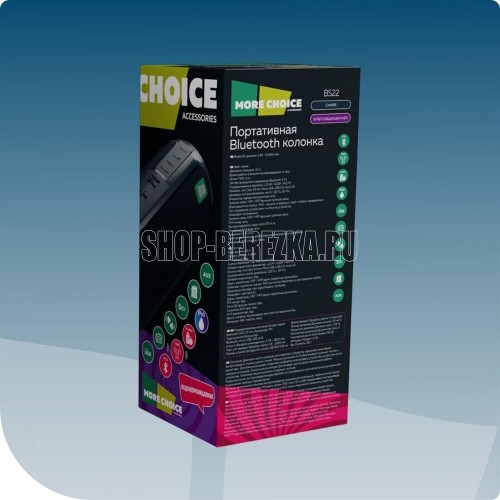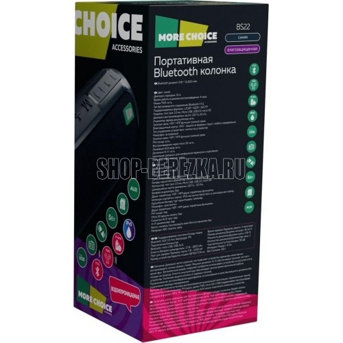 Колонка Bluetooth 5.1 2*5W 1800mAh More Choice BS22 1.Bluetooth: V5.1 2.Водонепроницаемость IPx5 3.Диапазон воспроизводимых частот: 120Гц-20Кгц 4.Время работы в режиме воспроизведения: 4 часа 5.Ёмкость батареи: 1800мАч 6.Тип подключения: mini Jack 3.5mm, micro USB, micro SD, USB 2.0