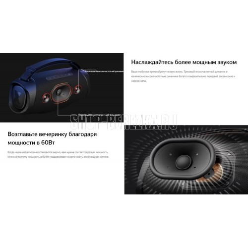 Акустический тип 2.1. Суммарная звуковая мощность 120 Вт. Расположение регуляторов на верхней панели. Встроенный микрофон ДА. Интерфейс подключения Bluetooth/USB. Версия Bluetoothv 5.1. Тип электропитания от аккумулятора. Вес товара 3000 грамм. Цвет черный. Размеры 370x151x147мм.