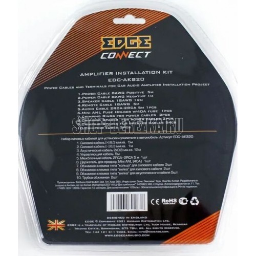 Кабель силовой 8Ga оранжевый - 5метров (ССА) Кабель силовой 8Ga черный - 1метр (ССА) Акустический кабель 16Ga - 12 метров (медь) Управляющий провод синий 18Ga - 5 метров (ССА) Межблочный кабель 2RCA-2RCA - 5 метров Держатель для предохранителя Mini-ANL - 1 штука Предохранитель Mini-ANL 40A - 1 штука Кольцо обжимное 8Ga - 2 штуки Вилка обжимная 8Ga - 2 штуки Вилки для подключения акустики 16Ga - 5 штук Втулка для 8Ga - 1 штука Обжимные трубки для 8Ga - 2 штуки Хомуты - 6 штук