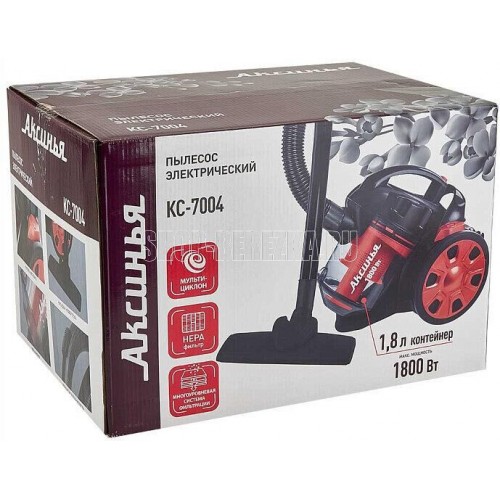 Максимальная мощность 1800 Вт Номинальная потребляемая мощность 1000 Вт Мощность всасывания 300 Вт Объём контейнера для сбора пыли 1,8 л Уровень шума ? 85 дБ Длина шнура питания 3,2 м Описание Пылесос электрический предназначен для сухой уборки помещений, чистки одежды, ковров и мягкой мебели, а также для других работ, связанных с использованием разрежения воздуха в бытовых и аналогичных им условиях Цвет: черный с красным Система «Мультициклон», обеспечивающая эффективную уборку без использования мешка для сбора пыли Съемный чистящийся HEPA-фильтр Многоуровневая система фильтрации Регулятор потока воздуха на ручке Сборная пластиковая труба Вертикальная парковка трубы всасывания на корпусе Шланг с ручкой Насадка «ковер-пол» Дополнительная комбинированная щелевая насадка Удобная ручка для переноски Автоматическое сматывание шнура питания Защита от перегрева