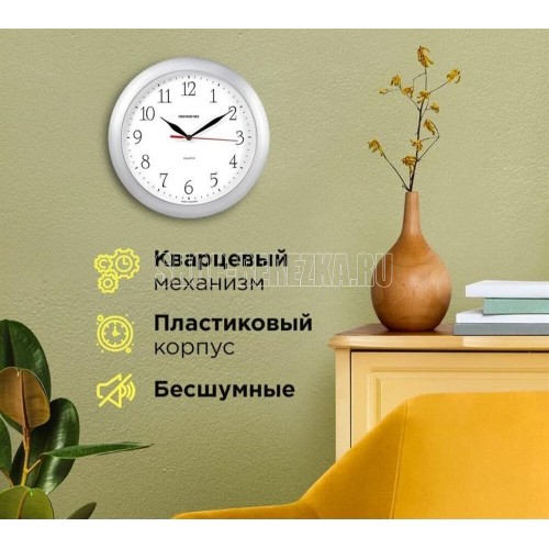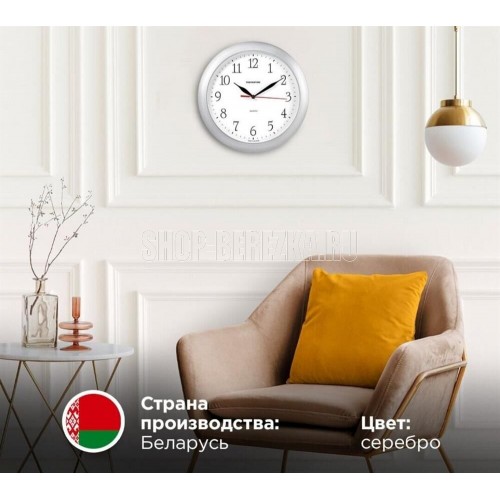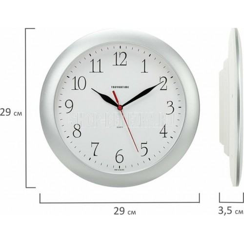 Категория: настенные, Тип механизма: кварцевый, Материал корпуса: пластик, Точный размер корпуса: 290х290х35 мм, Форма корпуса: круглые, Цвет корпуса: серебристый, Цвет циферблата: белый, Циферблат: стрелочный, Цифры: арабские, Ход: плавный.