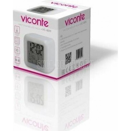 Настольные LED часы 3 в 1 Viconte VC-8011, Настольные LED часы 3 в 1 (будильник, термометр, календарь), размер: 8х8х8 см. Материал - высококачественный пластик. 7 режимов подсветки, питание от 3хААА батареек (в комплект не входят).