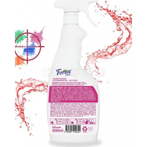 FOREST CLEAN Универсальный пятновыводитель 500 мл Гипоаллергенный универсальный пятновыводитель Forest Clean - универсальное средство для эффективного удаления загрязнений и трудновыводимых пятен от масла, жира, какао, ягод, травы, чернил, кофе, вина, крови и др. на одежде, спортивной обуви, коврах, мягкой мебели, текстильных и пластиковых изделиях и в салоне автомобиля. Подходит для предварительного замачивания, ручной и машинной стирки. Эффективен при низких температурах, сохраняет цвет тканей. Экологичный и безопасный пятновыводитель полностью выполаскивается из волокон ткани и не остается на одежде. Активная формула позволяет очищать межплиточные швы, текстильные и ковровые покрытия, белые пластиковые подоконники и присохший скотч. Не рекомендуется использовать для материалов с нестойкой окраской, а также для бархата, парчи, шёлка, ковров ручной работа и других материалов не предназначенных для влажной стирки.