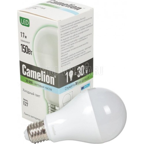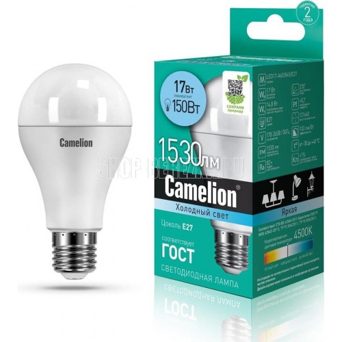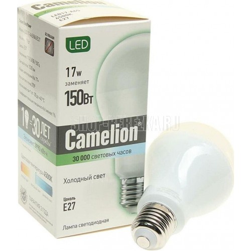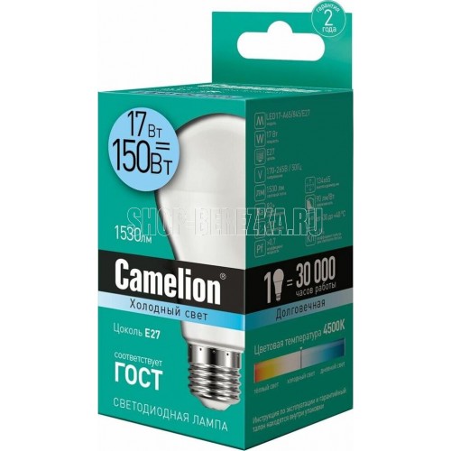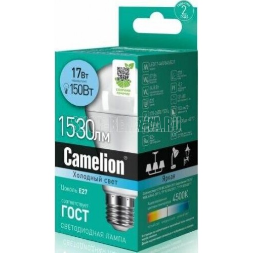 LED лампа, мощность, Вт - 17, напряжение, В - 170-265, световой поток, лм - 1530, форма колбы - груша, цвет колбы - белый, цоколь E27, цветовая температура, К - 4500, угол светового пучка - 270, индекс цветопередачи 80+, срок службы, ч. - 30000