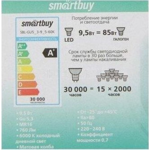 Характеристики SBL-GU5_3-9_5-60K Мощность, Вт 9,5 Аналог лампы накаливания 85 Высота, мм 48 Диаметр, мм 50 Диапазон рабочих температур - 25..+50°C Индекс цветопередачи, CRI Ra>80 Материал Пластик+металл Колба Матовая Напряжение, В 220-240 В Световой поток, лм 760 Светоотдача 80 Совместимость с выключателем с подсветкой нет Срок службы 2 года Форма колбы Софит Цветовая температура, К 6000 Тип цоколя Gu5,3