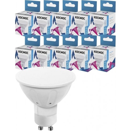 Тип цоколя GU10 Мощность (Вт) 10.5 Аналог лампы накаливания (Вт) 90 Количество в наборе 1 Тип продукта (локальный) Лампочка Технология Светодиодный (LED) Тип ламп Светодиодный (LED) Напряжение (В) 220-240 Цвет освещения Нейтральный белый Температура цвета (в K) 4500 Световой поток (Лм) 860 Устройство управления Настенный выключатель Особенности продукта Товар без особенностей Форма лампочки Спот Отделка стекла Матовый Основной материал Пластик Гарантия (лет) 1 Высота (мм) 55 Срок службы (ч) 30000 Марка КОСМОС Страна производства Китай