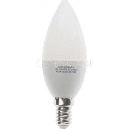 LED лампа, мощность, Вт - 8, напряжение, В - 170-265, световой поток, лм - 750, форма колбы - свеча, цвет колбы - белый, цоколь E14, цветовая температура, К - 4500, угол светового пучка - 220, индекс цветопередачи 80+, срок службы, ч. - 30000