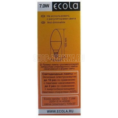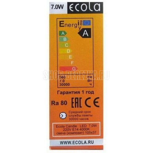 ECOLA candle LED 7,0W 220V E14 4000K свеча (композит) 105x37 Цоколь Е14 Форма свеча Мощность 7,0W Цветовая температура 4000K Напряжение 220В Средний срок службы 30000 часов Размер 105x37 мм