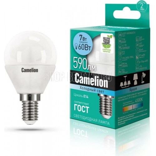 СДЛ Camelion - это инновационное решение, разработанное на основе новейших светодиодных технологий (LED). Предназначена для освещения жилых, офисных и коммерческих помещений. Встроенный источник питания позволяет использовать СДЛ Camelion в стандартных патронах. LED лампа, мощность, Вт - 7, напряжение, В - 170-265, световой поток, лм - 630, форма колбы - шар, цвет колбы - белый, цоколь E14, цветовая температура, К - 4000, угол светового пучка - 220, индекс цветопередачи 80+, срок службы, ч. - 30000