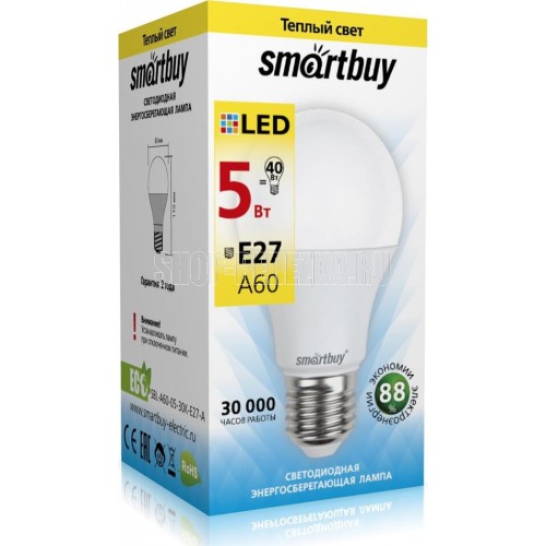 | ОБЩИЕ | Лампа светодиодная SmartBuy SBL 3000К, E27, A60, 5Вт |