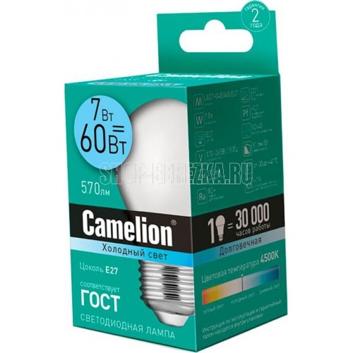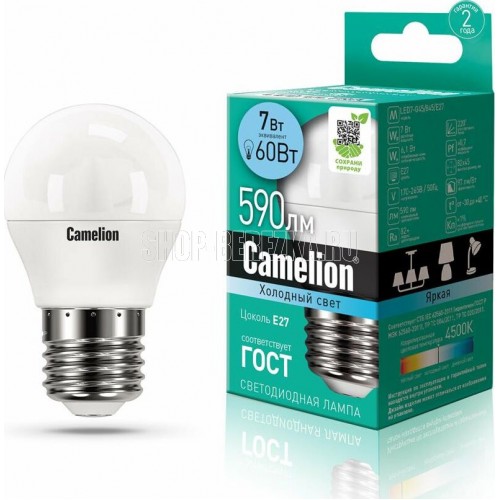 LED лампа, мощность, Вт - 7, напряжение, В - 170-265, световой поток, лм - 590, форма колбы - шар, цвет колбы - белый, цоколь E14, цветовая температура, К - 4500, угол светового пучка - 220, индекс цветопередачи 80+, срок службы, ч. - 30000